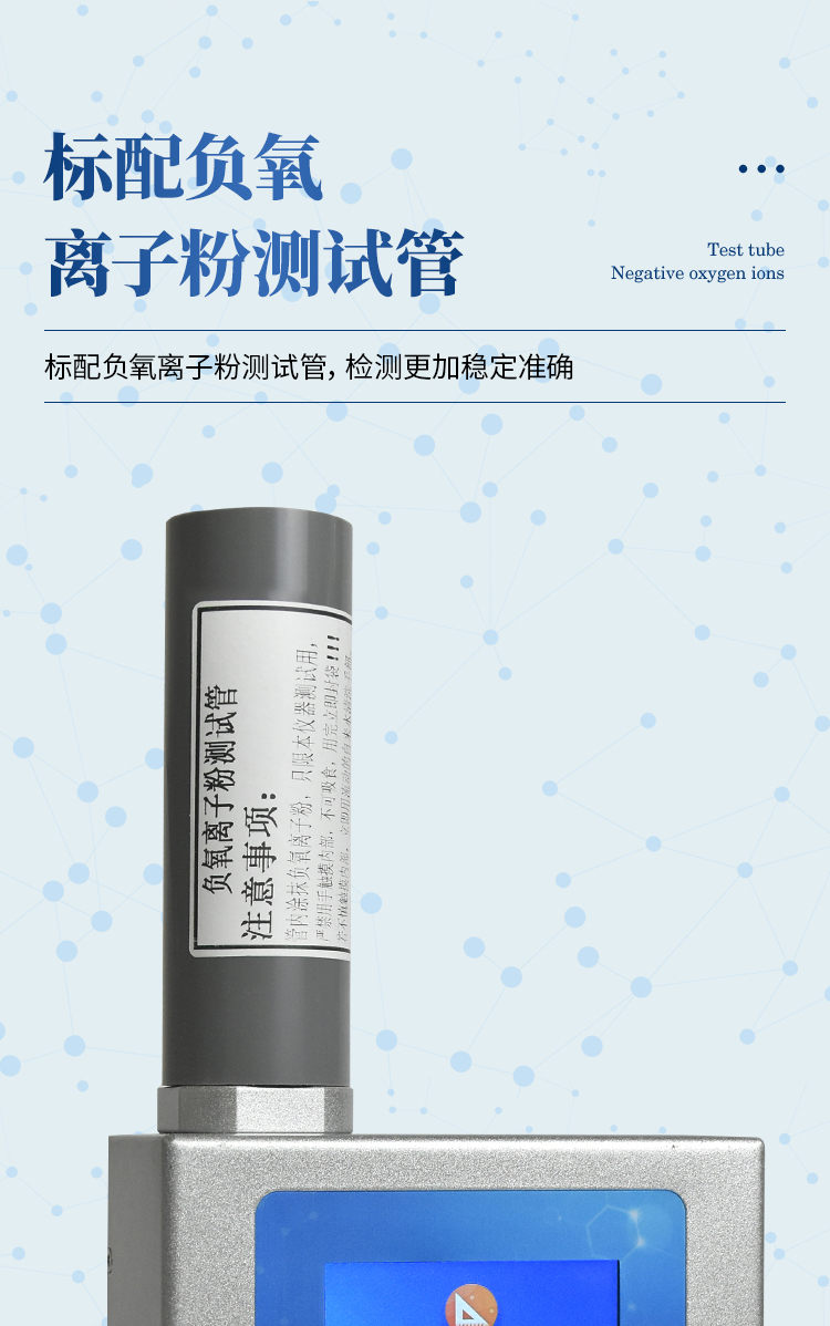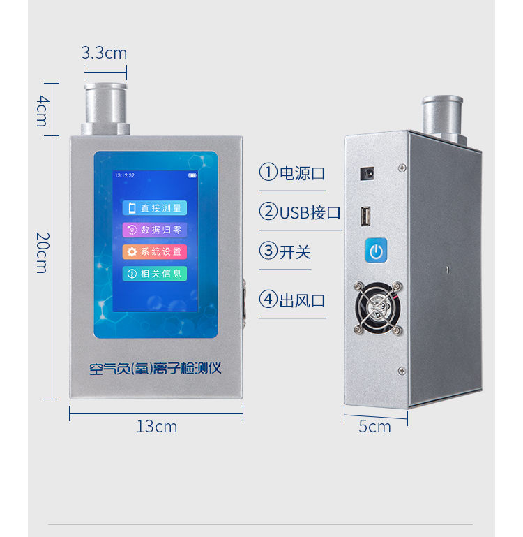 1、屏幕显示:5.0英寸电容触摸屏,800*480高分辨率,实时显示负(氧)离子测量结果;